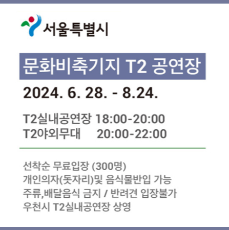 **장소:** - 1관: 문화비축기지 T2 실내공연장